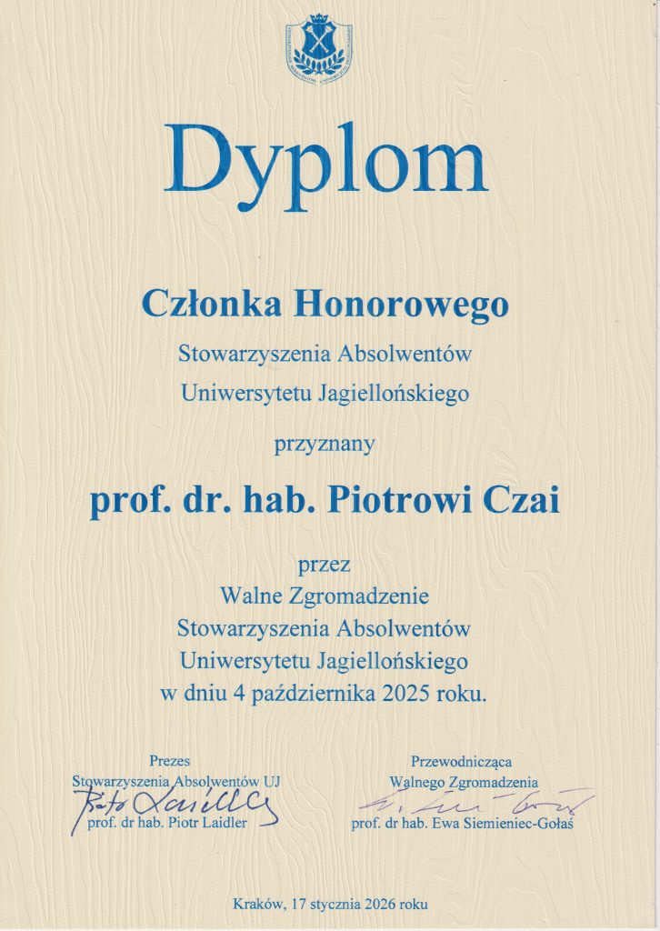 Wydarzeniem dnia – dla Stowarzyszenia Wychowanków AGH – było wręczenie prof. Piotrowi Czai – prezesowi SW AGH, dyplomu Honorowego Członka Stowarzyszenia Absolwentów UJ nadanego przez walne zgromadzenie SA UJ 4 października 2025 roku.