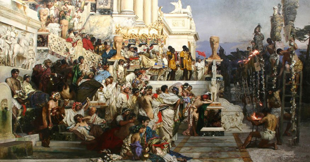 W połowie XIV wieku w miejscu średniowiecznych kramów pośrodku Rynku Głównego wzniesiono gotycką halę, którą w XVI wieku przebudowano w stylu renesansowym. Pod koniec XVIII stulecia, oprócz dotychczasowej czysto użytkowej funkcji magazynowo-handlowej Sukiennice zyskały znaczenie symboliczne. Wydawane tu bale i przyjęcia ku czci osobistości odwiedzających miasto oraz świętowanie licznych uroczystości patriotycznych, sprawiły, iż ta wznosząca się w samym centrum Krakowa budowla stała się miejscem niezwykle istotnym dla kultury narodowej. Dzisiejszy kształt i szczególną funkcję reprezentacyjną Sukiennice zyskały po restauracji przeprowadzonej w latach 1877–1879. W 1879 roku sale pierwszego piętra gmachu Sukiennic wybrane zostały na siedzibę powstającego Muzeum Narodowego, którego kolekcję zapoczątkował Henryk Siemiradzki, ofiarując tworzącemu się muzeum swój obraz „Pochodnie Nerona”.